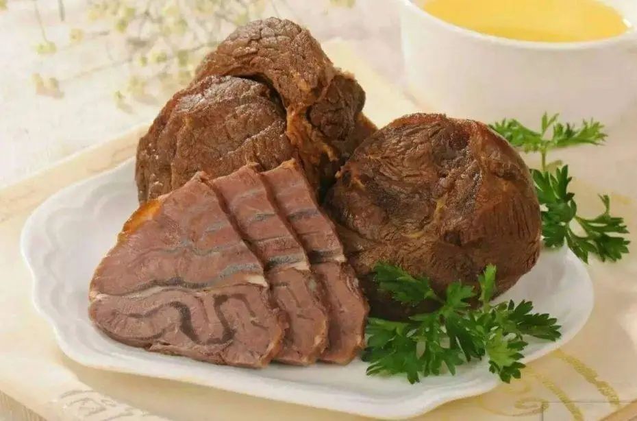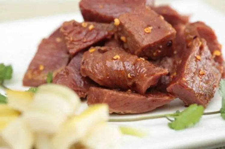 传统五香牛肉加工过程中,煮制时间长,耗能多,产品出品率低,而低温酱卤牛肉以成熟牛肉为原料,利用低温熟制、真空包装、二次杀菌综合栅栏技术和真空滚揉技术,在卤汤中加入1%的中草药,使制品柔嫩多汁、风味独特、软硬适中、营养保健、品质优良、出品率高。驴肉、羊肉、兔肉亦可参照此工艺生产。