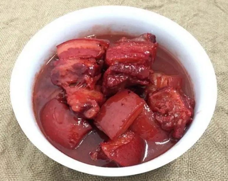 当锅内白汤沸腾时加入红曲米、绍酒和糖(用糖量为总糖量的4/5),再改用中火焖煮1h左右至肉色为深樱桃红色、汤将干、肉已酥烂时即可出锅。出锅时需用尖筷逐块取出,放在盘中逐行排列,不能叠放。香料、桂皮、八角茴香可重复使用,桂皮用到折断后横切面发黑时为止,八角茴香用到角脱落时为止。