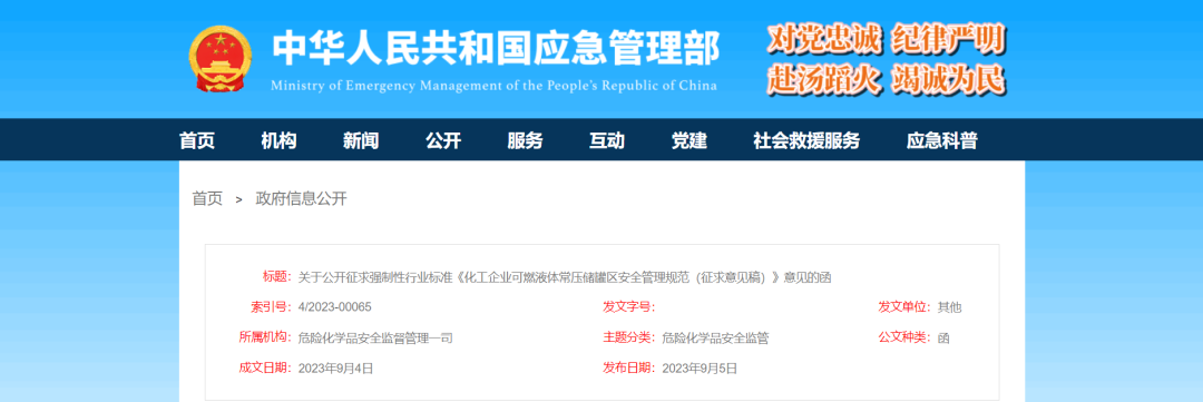 为强化化工企业可燃液体常压储罐区安全风险管控,应急管理部危化监管一司组织有关单位编制了《化工企业可燃液体常压储罐区安全管理规范(征求意见稿)》和编制说明(见附件1、2),现公开征求意见。此次公开征求意见时间为即日起至2023年11月6日,反馈意见请填写应急管理标准项目征求意见表(见附件3)后发送至指定电子邮箱(cycgqaq@163.com)。