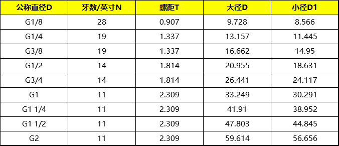 GB7307-1987常用55°圆柱管螺纹尺寸表(PF、G)