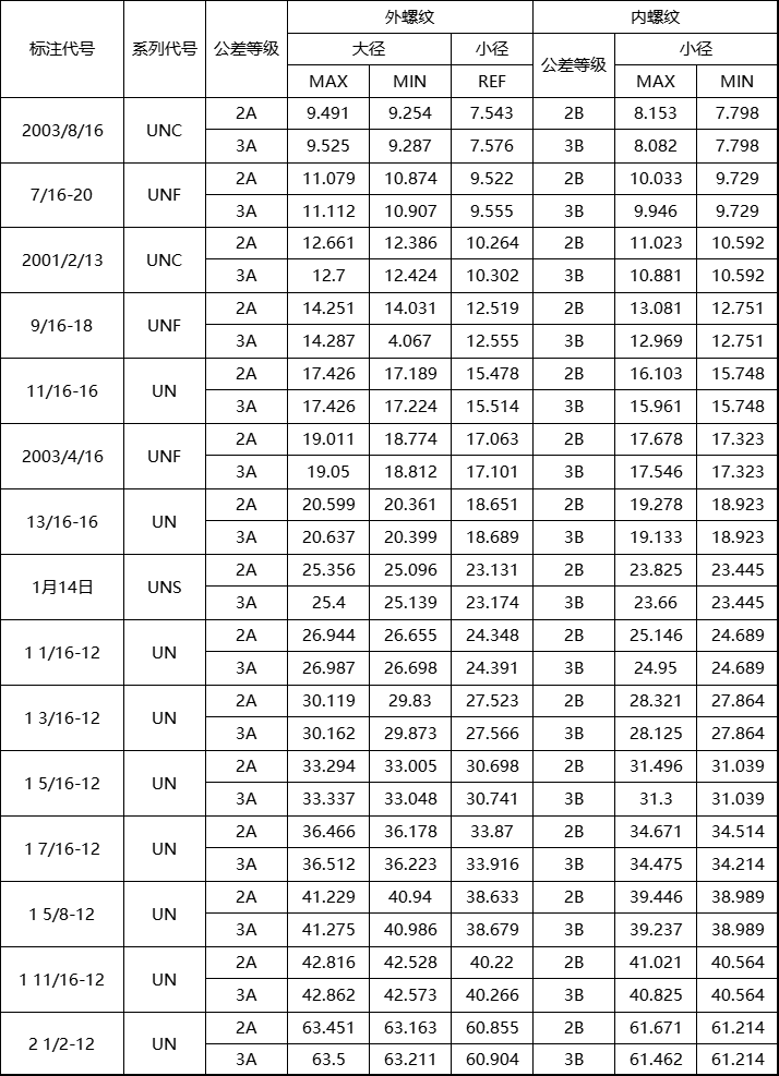 美制螺纹的标准系列包括粗牙(UNC)、细牙(UNF)和超细牙(UNEF)三个系列,外加一个定螺距系列(UN)。完整的标记由公称直径、每英寸牙数、系列代号、精度等级和检验体系代号组成:2-12UN-2A(23) 3/4-18UNS