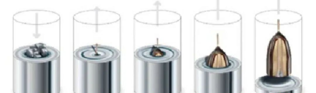 当硅熔浆的温度稳定后,将晶种慢慢下降进入硅熔融体中(晶种在硅熔融体内也会被熔化),随后将具有一定转速的晶种按照一定的速度向上提升,最后生产出合格的硅晶柱。硅晶柱质量的关键在于硅的纯度和硅的单晶性。硅晶柱直径越大,则硅的单晶性越难掌控,质量也越难保证,因此直径越大的硅晶柱制程的技术门槛也越高。长晶生成硅晶柱的制造过程主要包括润晶、缩颈、放肩、等径生长、收尾等复杂的工艺流程。(见图)