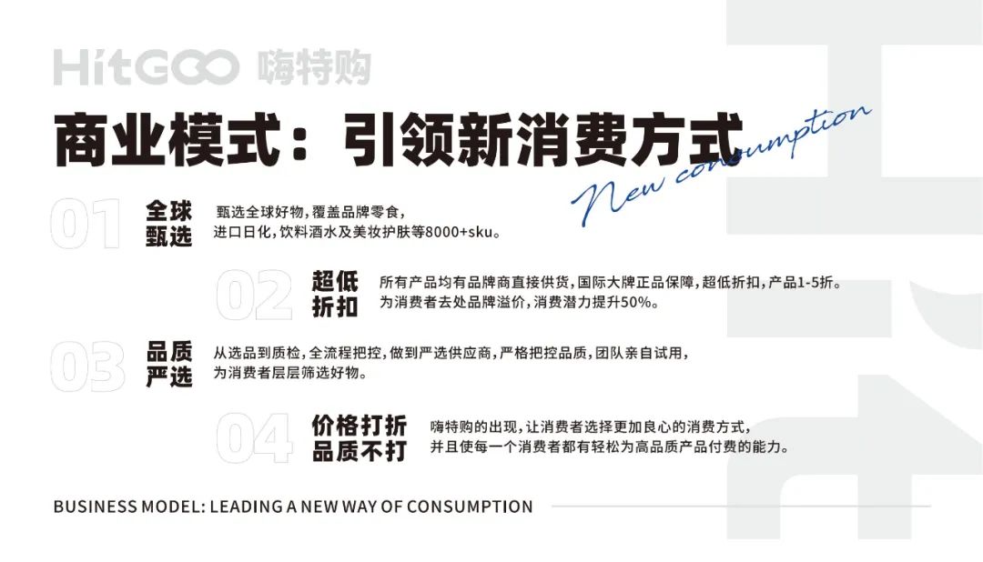 嗨特购Hitgoo除了与全球百家品牌和供应商达成深度战略合作协议,还通过国内外买⼿团队,在全球搜罗新品牌和新产品,为客户提供极致性价⽐的购物体验和更多选择。