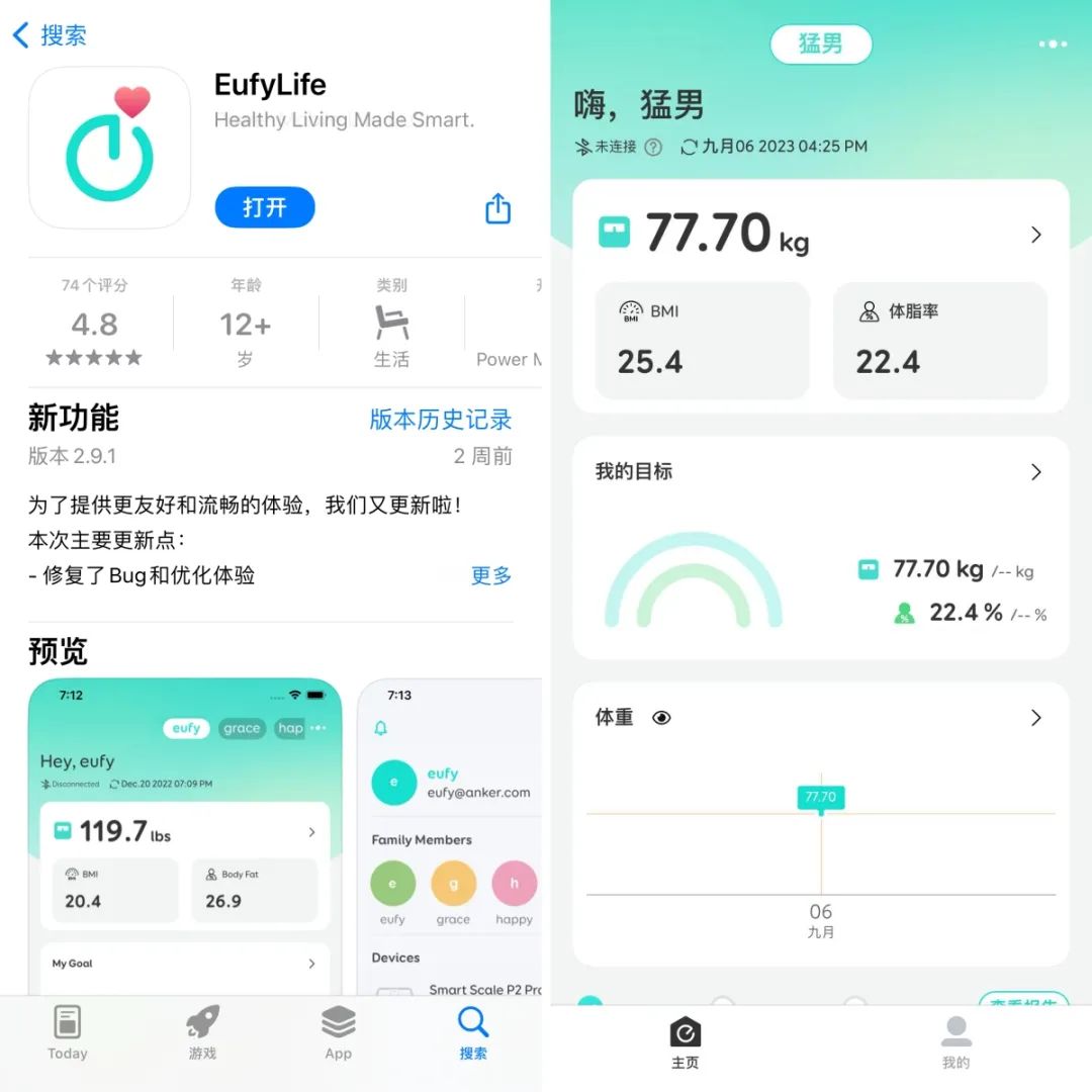 可以通过appstore下载EufyLife来查看更加详细的身体数据!并将智能体脂称与手机连接,就可以实时查看和追踪身体指标了。这款应用程式支持Andriod和iOS系统,非常易于操作和使用。