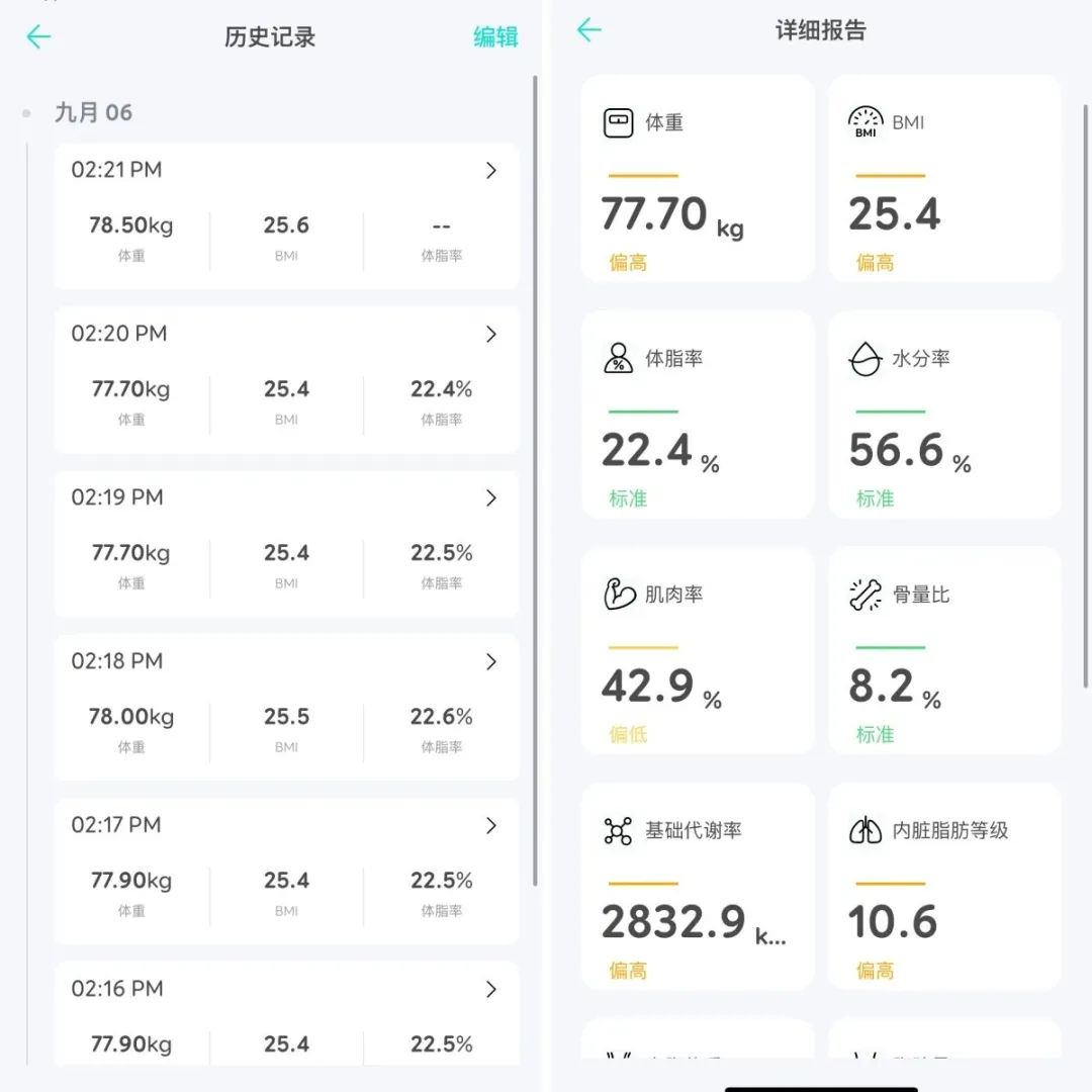 每一次测量数据都被精确的记录下来!可以通过身体的数据判断身体是否缺乏锻炼和饮食是否过意油腻,健身人士能通过这些数据调整饮食和训练。