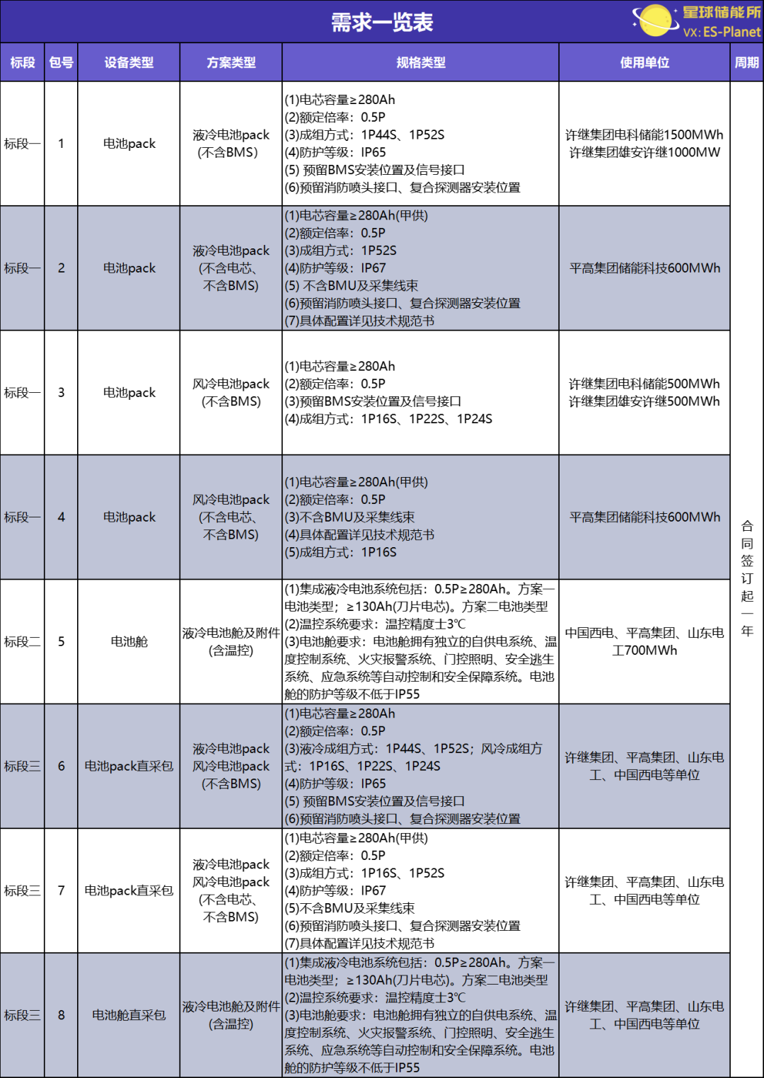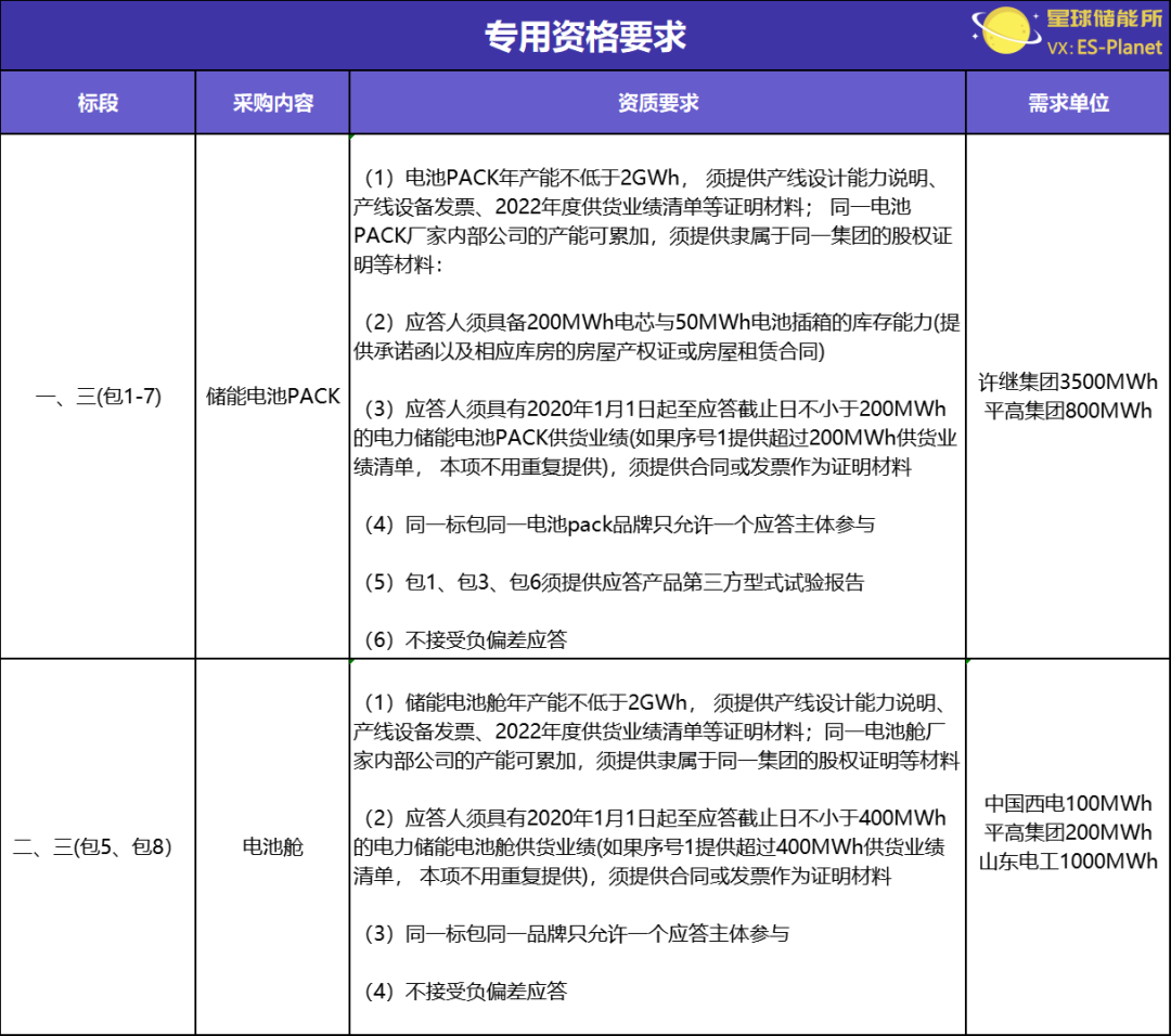 中国电气装备集团有限公司储能用电池规模集中采购招标公告发布于7月28日,主要采购内容为电池PACK和电池舱,值得注意的是,该采购项目对于应答方的专用资格要求十分详细。