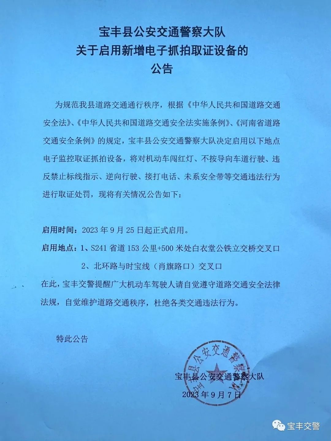 为规范我县道路交通通行秩序,根据《中华人民共和国道路交通安全法》、《中华人民共和国道路交通安全法实施条例》、《河南省道路交通安全条例》的规定,宝丰县公安交通警察大队决定启用以下地点电子监控取证抓拍设备,将对机动车闯红灯、不按导向车道行驶、违反禁止标线指示、逆向行驶、接打电话、未系安全带等交通违法行为进行取证处罚,现将有关情况公告如下: