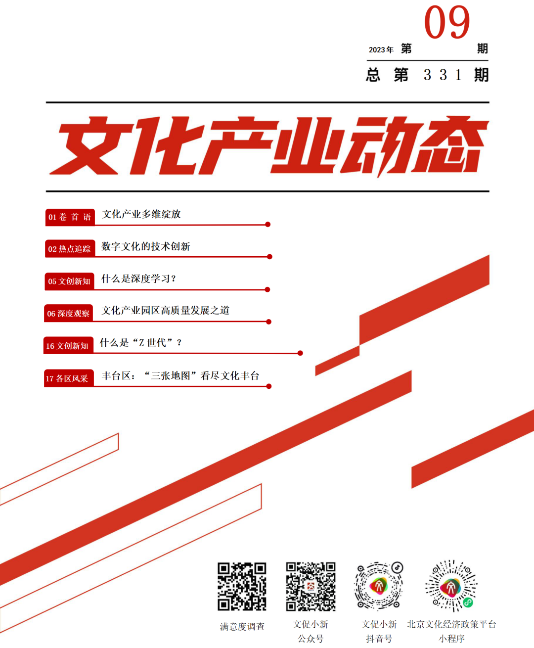 本期热点追踪栏目聚焦最新政策,分享《乡村文化和旅游带头人支持项目实施方案(2023—2025年)》,以及上海市、成都市、郑州市关于元宇宙政策的重要目标;聚焦产业动态,解读第十五届“全国文化企业30强”,预测文化元宇宙AIGC将推动全球数字文创产业的五大趋势。深度观察栏目关注第十九届深圳文博会上的文化产业园区高质量发展论坛,文化和旅游部产业发展司司长缪沐阳、北京京和文旅发展研究院院长范周、中央党校(国家行政学院)教授祁述裕等专家共话文化产业园区创新发展之道。文创新知栏目带您了解“Z世代”的起源、内涵及特征;理解“深度学习”的概念和意义。本期各区风采栏目走进丰台区,以产业、文旅、戏曲三张地图,透视丰台区产业发展的文化内核。