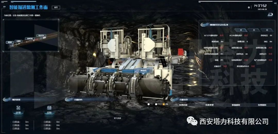 对煤矿井下掘进开采设备工作状态、工况信息进行实时动态监测及真实复现,结合精确定位系统,判断前进方向、精确位置、位移等状态信息,展示设备运行状态和预告警信息,支持查看设备工况、机载视频、工作面视频等详细信息为掘进工作监督管理提供全面高效的决策支持。
