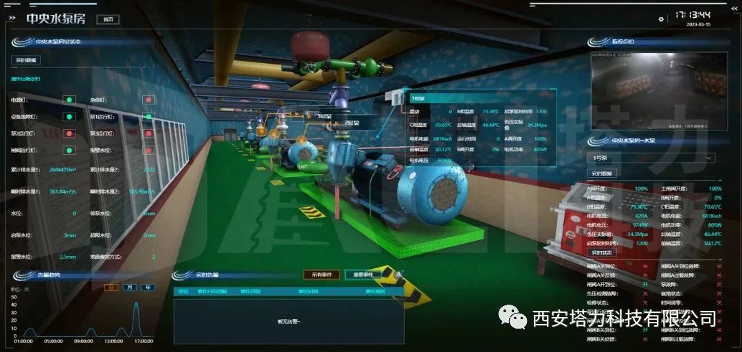 构建井下中央水泵房场景还原,展示主排水泵、电机、主排水管路、吸水管,对接矿山水泵房监控系统,实时展示水泵运行参数、电机温度,电机运行状态、闸阀开关状态及是否到位。对管路的排水流向、内外水仓液位等信息进行直观展示。