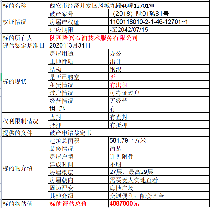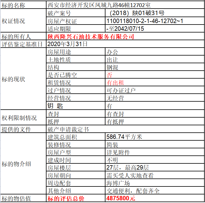 陕西鑫隆石油设备有限公司破产清算涉及的相关资产:西安市经济开发区凤城九路46幢12702室。