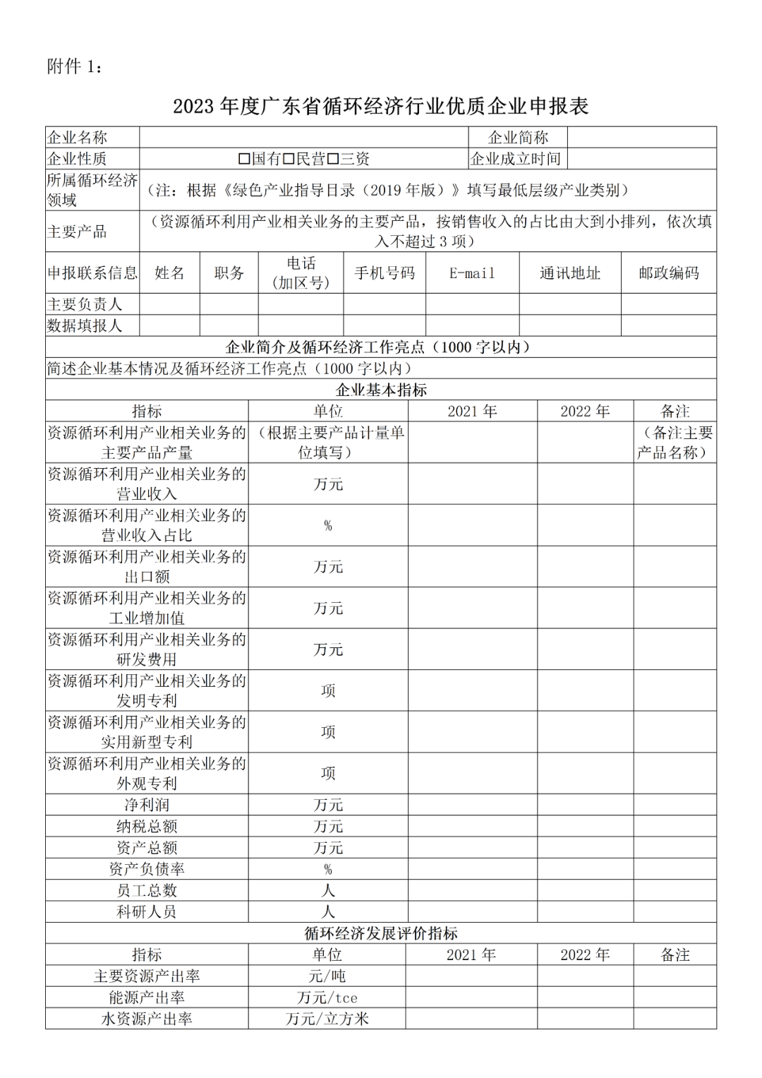 1、2023年度广东省循环经济行业优质企业申报表