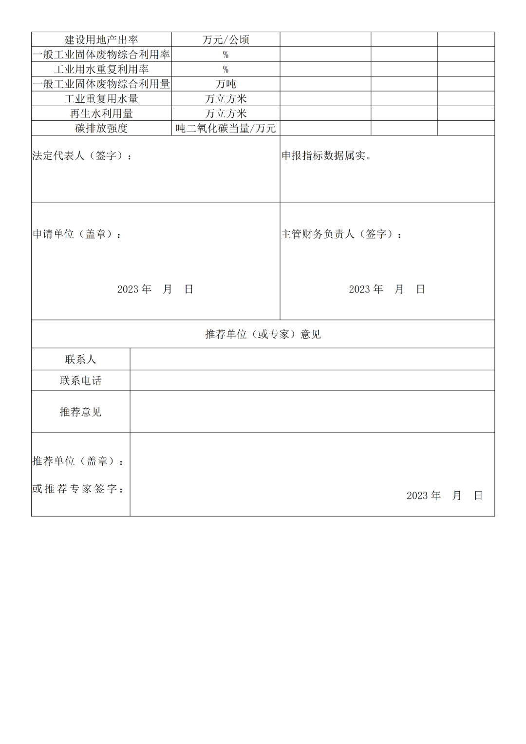 四、推荐单位(或专家)意见栏:我协会会员单位可以直接申报;其他申报企业可由各地方循环经济相关行业组织或相关行业正高级以上专家填写联系人、联系电话和推荐意见后盖章(签字)确认推荐。