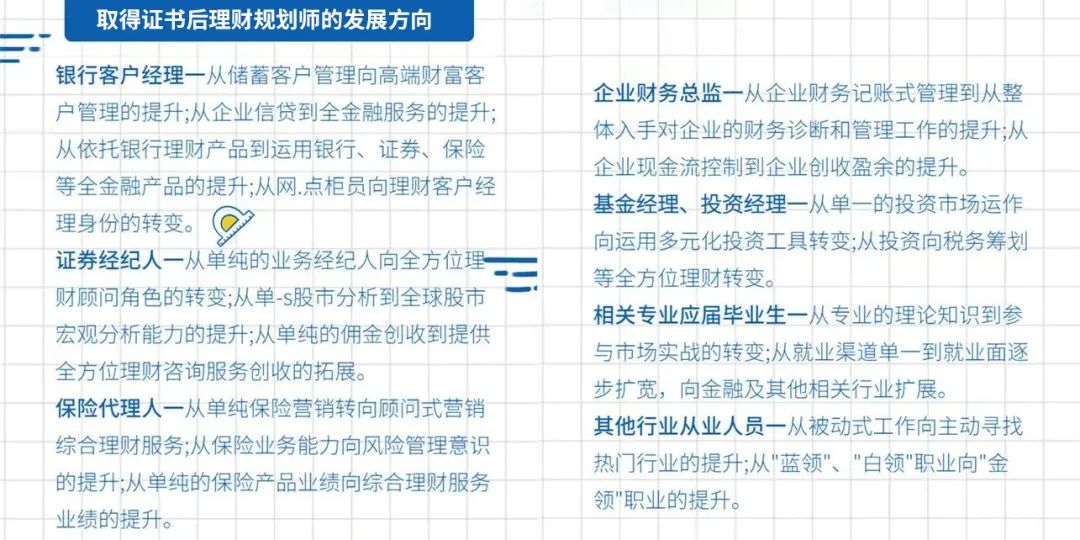 CHFP理财规划师包含现金规划、保险规划、收入与支出规划、投资规划等八大理财规划。因为其涉及面广、知识全面且报考难度相对较低,近年来越来越受金融从业者欢迎。