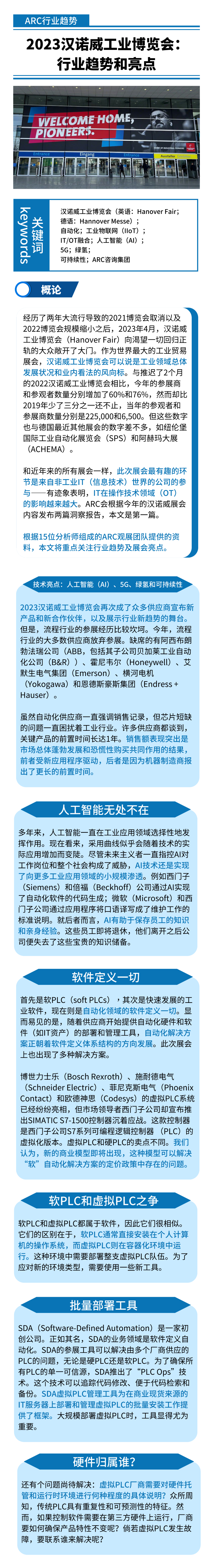 关键词:汉诺威工业博览会(英语:Hanover Fair;德语:Hannover Messe);自动化;工业物联网(IIoT);IT/OT融合;人工智能(AI);5G;绿氢;可持续性;ARC咨询集团