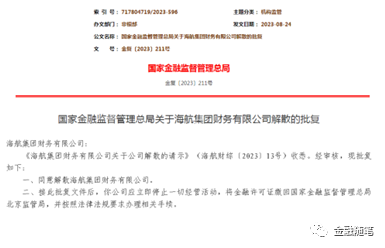 8月30日,国家金融监督管理总局官网发布批复公告,宣布海航集团财务有限公司解散。这是近期因经营不善而被监管部门宣布解散的第二家企业集团财务公司。此前一家是新凤祥财务公司,于7月19日被国家金融监督管理总局官网发布批复公告,宣布进入破产程序。