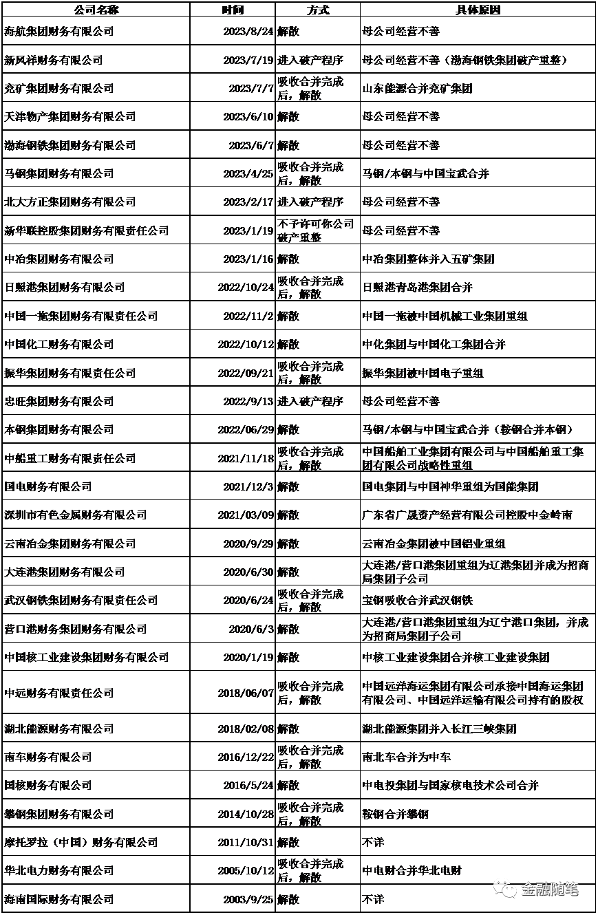 通过整理国家金融监督管理总局公开的历史批复,我们发现,这31家消失的财务公司,原因大体有两种类型。一是企业集团合并导致的财务公司牌照撤销,二是被股东拖累而破产。31家消失的财务公司中,企业集团间兼并重组而撤销执照的企业数量达22家。这些财务公司在撤销牌照的同时,一般由合并方财务公司承接业务,或其中一些公司还保留了自身机构,并成为合并方的当地分公司。这种情形大多发生在央企并购重组的过程中,作为整体重组方案一部分。因为一家企业集团只允许保留一家财务公司,因而被并购方企业的财务公司即被撤销执照。这种情况下被撤销执照,与财务公司及其所属集团的自身经营状况的关联度并不算太大。31家消失的财务公司中,有7家财务公司属于因母公司经营不善而导致财务公司进入破产流程或要求清偿完毕才允许进入破产流程的情形。