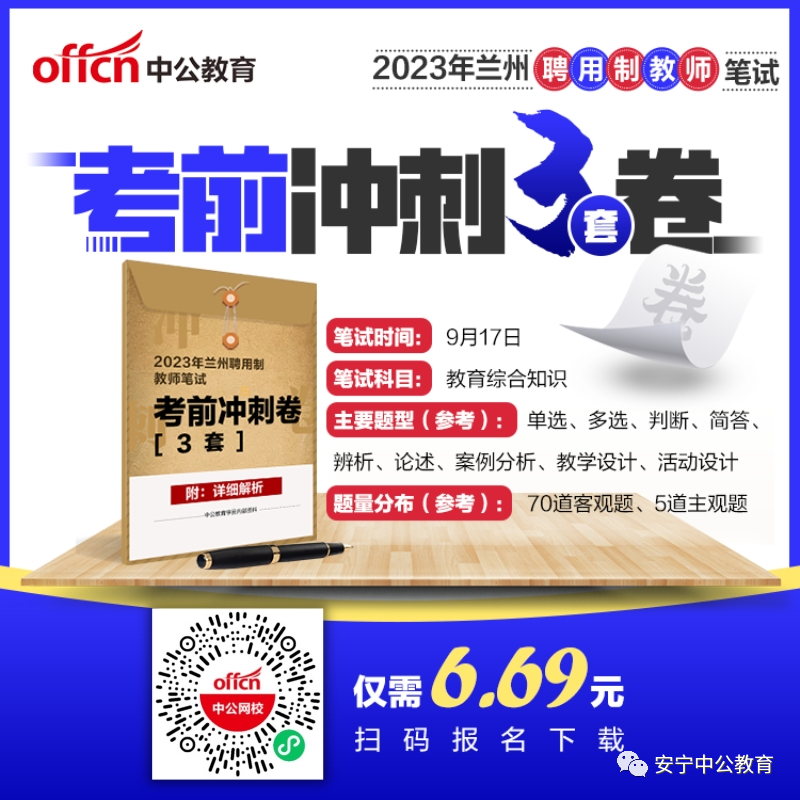 兰州聘用制教师最新考前冲刺3套密押卷上线啦!!结合最新教育时政考点,严格根据历年考题研发,含答案和内部解析,限时仅需6.69元,即可下载学习,打印学习刷题效果更好,下载入口:https://i.offcn.com/c/1510008?mis=lht74958
