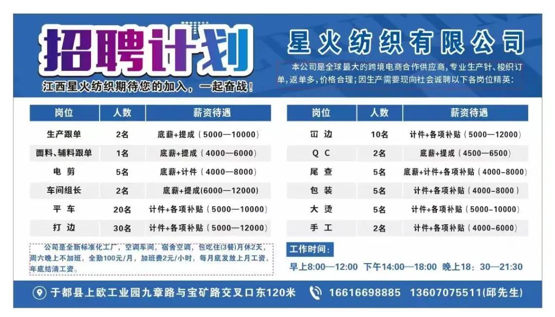 江西星火纺织有限公司是一家专业研发国外贸订单的时装企业,专业生产针织,单量大,翻单多,价格合理,公司全新空调车间,衣车设备,宿舍空调,包吃住(3)餐,月休2天,周六晚上不加班,全勤100/月,加班费2元/小时,每月底发放上月工资,年底结清工资,各职位待遇从优,新进厂员工前两个月享有20%工资奖。