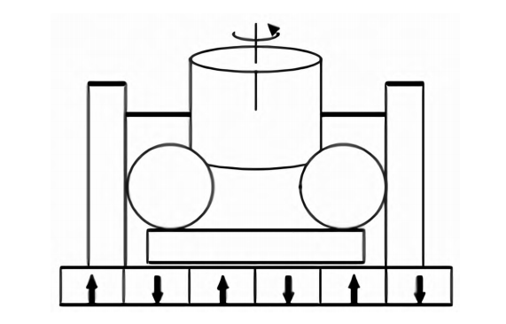 双V形槽研磨加工方式 | 相比于普通同心圆,被加工球的表面与上下盘的接触点由三点接触变为四点接触 | 过程中自旋角的变化也是随机性的,加工精度得到提高,但是装置的复杂性提高,V形槽的中心线必须要保持一致,否则整个加工过程会不顺畅,影响加工效率 |