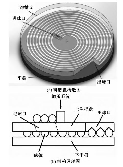 为了实现大循环批量加工,在此基础上提出多线变曲率沟槽加工方式,该方式通过在沟槽盘上设置多线变曲率螺线沟槽,既可以使球体在研磨加工时不断改变自转角大小,又可以使多个球体同时进出研磨盘,再通过外置的输球料盘即可实现大循环批量加工。