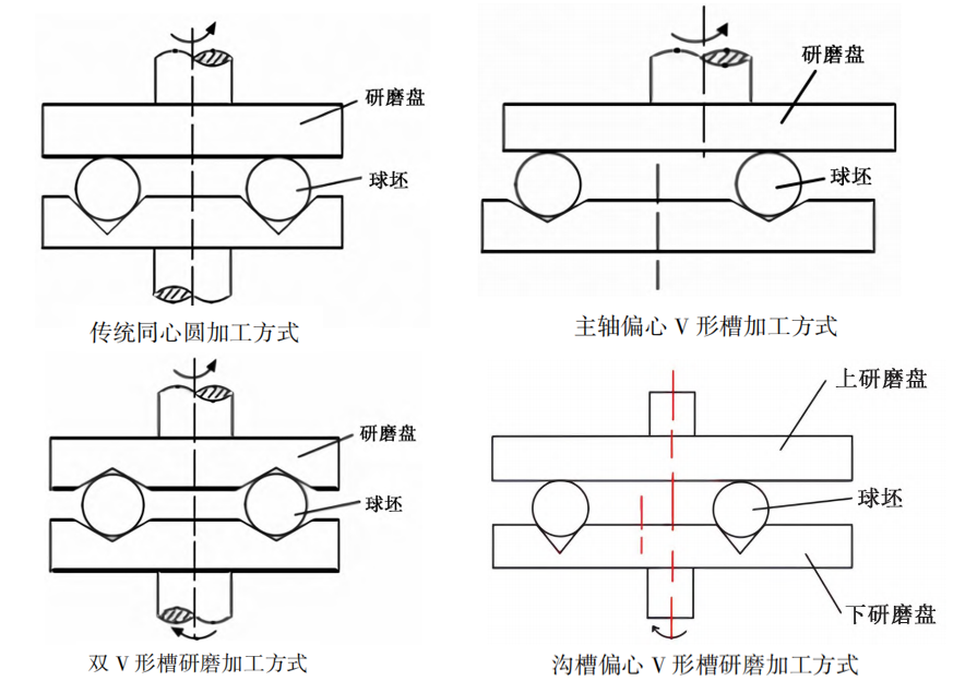 偏心V形槽研磨加工方式 | 上研磨盘与下磨盘的回转中心不在同一条直线上,加工过程中有更好的研磨轨迹 | 比普通同心圆V形槽研磨加工方式有更好的球形偏差,可进行批量加工,但装置较为复杂,提高了生产成本 |