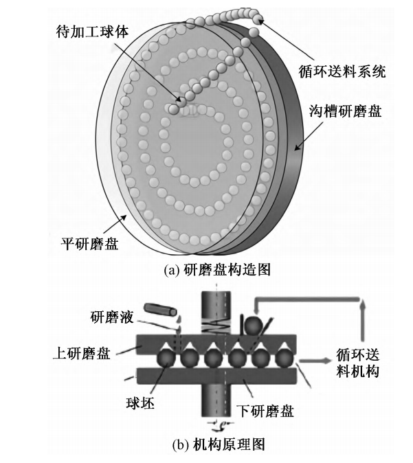 该方式通过该曲率半径的变化而改变球体自转角,能实现球体的高效、高一致性加工,但装球量受到装置的限制,不易实现大循环批量生产。