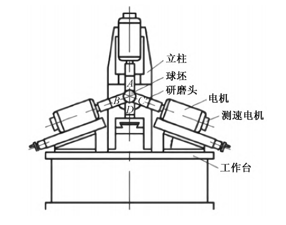 杯状研具研磨加工方式主要有三种,分别是单轴、双轴及四轴杯状研具加工方式。这种加工方式的四轴都有驱动力,能够不断地改变运动方向,从而改变球体的自转角,加工球体的精度高,但是加工装置复杂,且只能针对一个球体进行加工,多用于定位球和标准球加工,无法满足工业的批量需求。