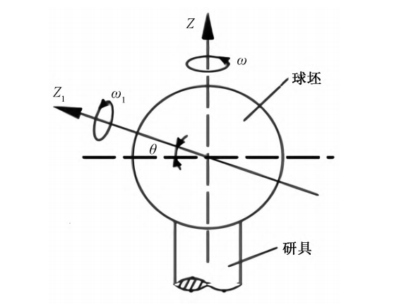 变曲率沟槽研磨加工方式可以使自转角有一个较大范围的改变,以便使球体加工轨迹的分布更加均匀完整,研磨加工过程中球坯从研磨盘中心向外做滚动运动,使得球坯与沟槽的接触点位置一直在发生改变,自转的相对速度也在不断变化,这种研磨加工方式的自转角在不断地发生变化,加工效率和加工精度得到提高。