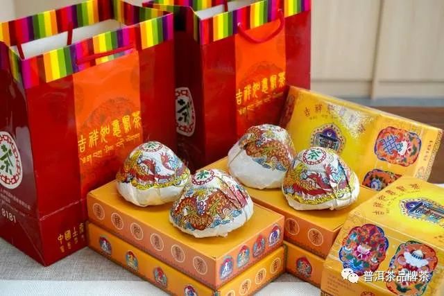 每盒沱茶都有精美礼盒包装,金黄色的礼盒尽显庄严大方,每盒都配套一个红色手提礼袋。明红金黄相接,非常喜庆吉祥。