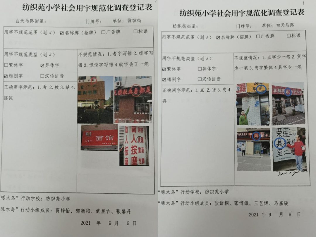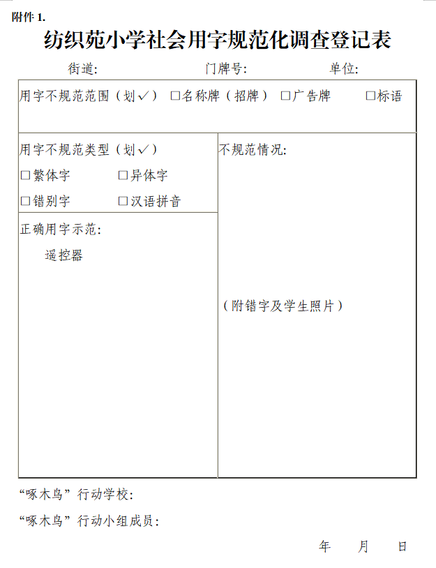 4.五年级开展啄木鸟行动——寻找错别字、不规范字。各班组织学生利用课余时间寻找、发现作业中、电视广播中以及学校、家庭等周边不规范用语和不规范用字现象,以四人小组为单位完成活动记录表。