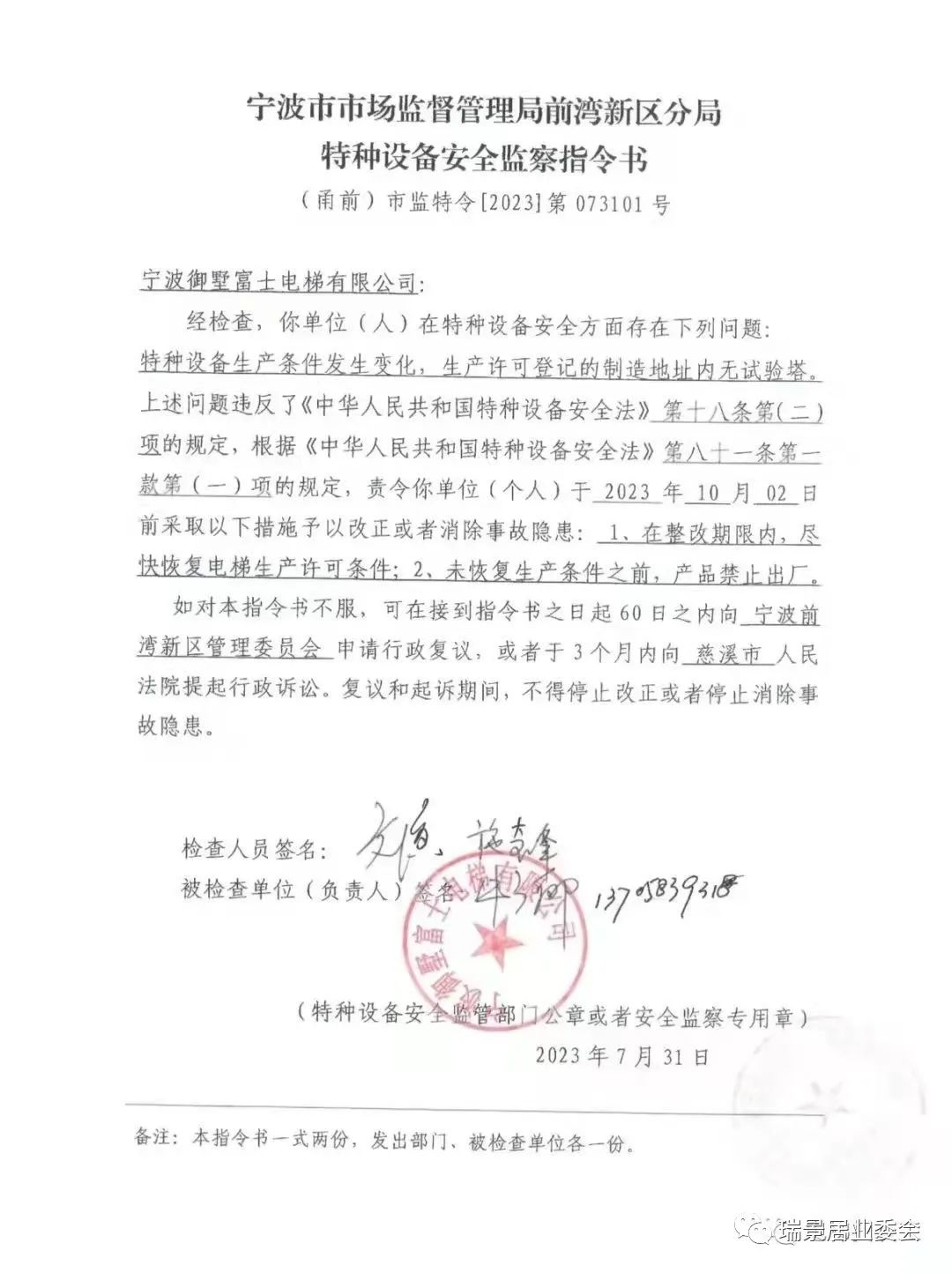 经业主查询,宁波御墅富士电梯公司最近问题多多,正在接受当地有关部门对其产品出厂的禁止令。关于2栋5栋的电梯,就目前情况,宁波富士电梯不单质量问题存在质疑,而且已被禁止出厂,因此会给到货安装带来长时间的延迟问题,因此,请重新征询业主购买意愿,尽快决定购买品牌和时间。
