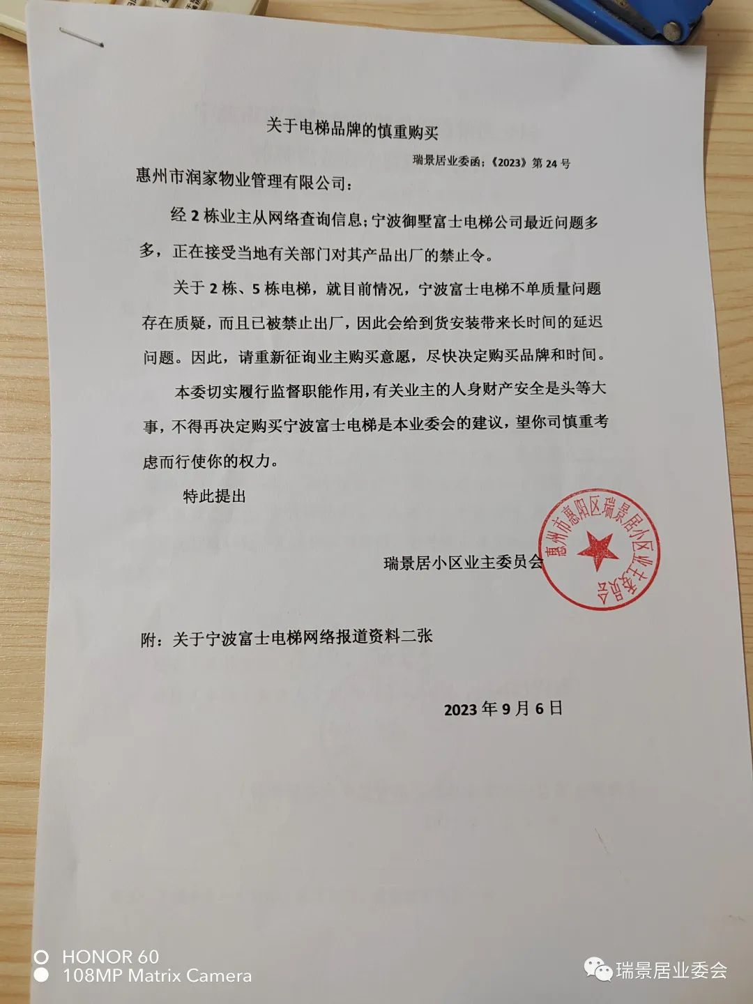 本委履行监督职能作用,有关业主的人身,财产安全是头等大事,不得再决定购买宁波御墅富士电梯,是本业委会的建议,望你时慎重考虑而行,使你的权利