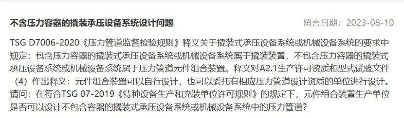 答:撬装式承压设备系统(包含压力容器和压力管道)应按《质检特函[2016] 46号》的相关规定执行。不包含压力容器的撬装式压力管道系统应纳入压力管道元件中的工厂化预制管段进行管理,相关的设计、制造和制造监督检验应按工厂化预制管段的相关要求执行。