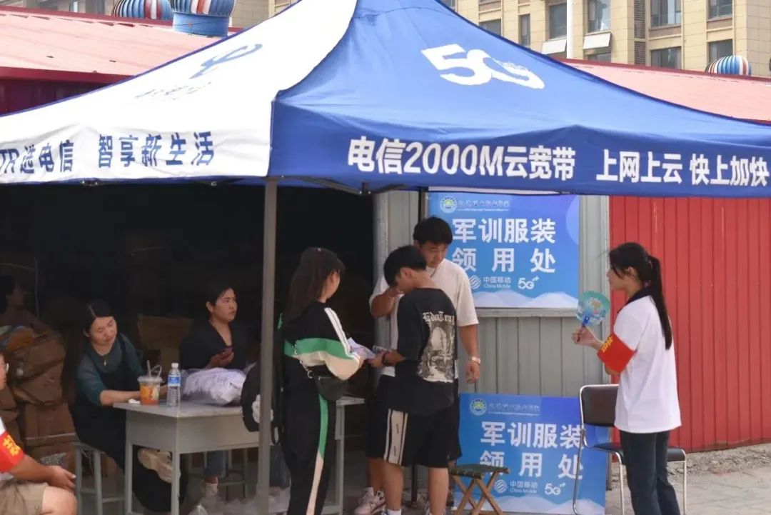 服装和被褥的领取地点在5号楼西侧,新生们可在返回宿舍前顺路去领取自己的服装和被褥,也可在放下行李后徒步前往,地点就在宿舍楼旁边。