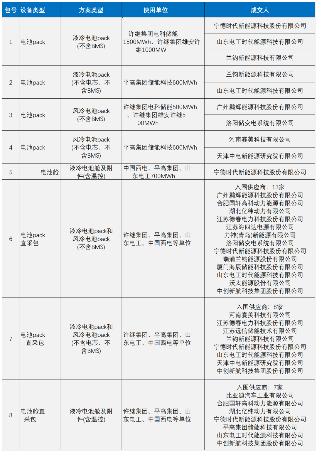 9月6日,中国电气装备集团有限公司公布了储能用电池和储能IGBT规模集中采购成交人名单,共26家企业入围,其中宁德时代、山东电工时代同时入围5个包,中创新航入围3个包,洛阳储变电系统、河南赛美科技、天津中电新能源、湖北亿纬动力同时入围2个包。据此前招标公告,采购的设备类型包括了电池pack、电池舱、电池舱直采包、储能IGBT等。