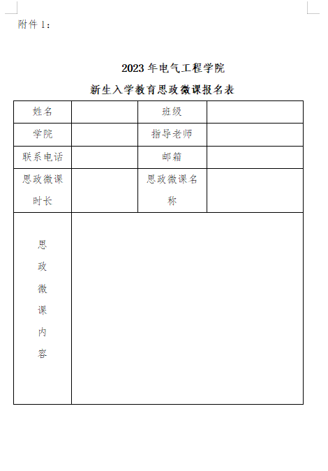 1.请各班于9月20日下午15:00前将新生入学教育思政微课作品及报名表以压缩包形式,统一命名为“XX班级+新生入学教育思政微课”发送至电气工程学院学院文体部邮箱dqgcxywtfzb@163.com