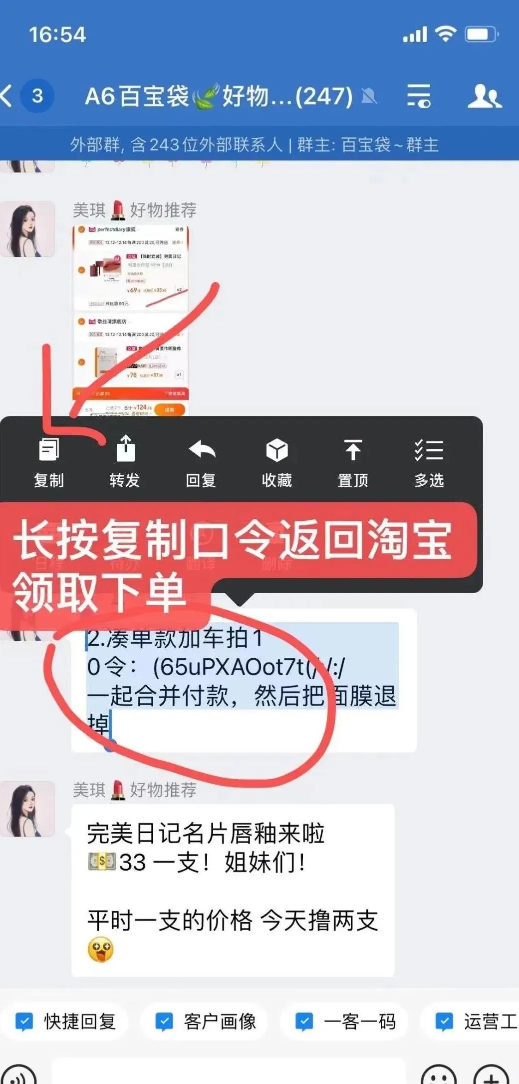 如下图所示,选择一键复制口令,再打开淘宝APP,商品就会自动弹窗出来。