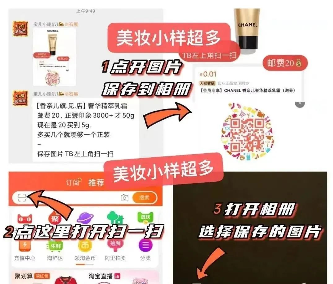 如下图所示,点开图片保存到相册,再打开淘宝APP左上角扫一扫