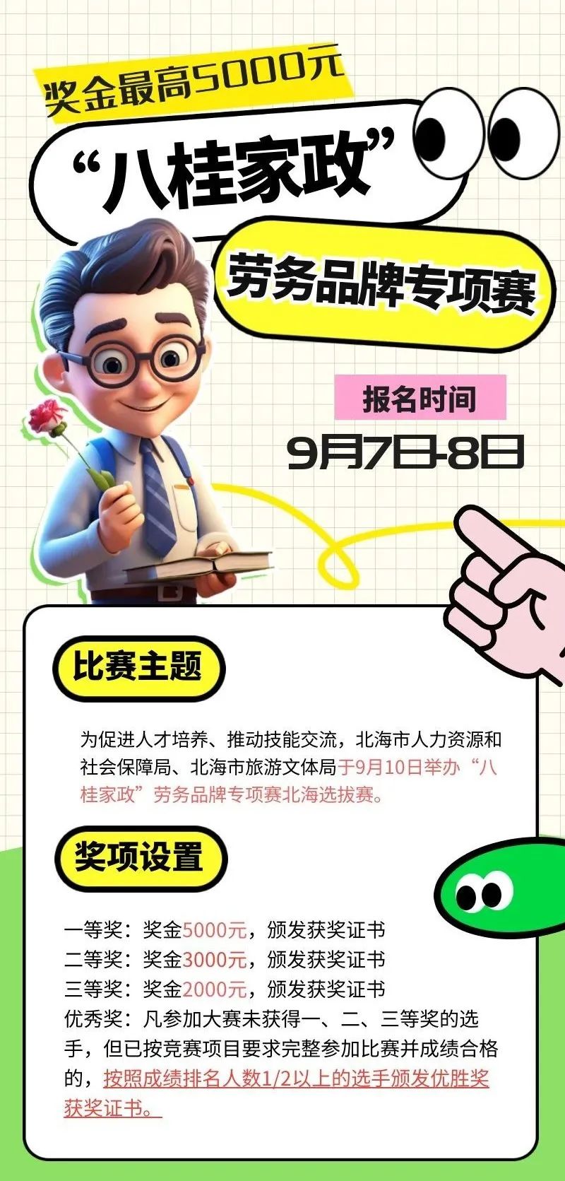 为突出“八桂家政”劳务品牌属地特点,扩大影响力,营造“劳动光荣、技能宝贵、创造伟大”的良好氛围,北海市人力资源和社会保障局、北海市旅游文体局计划于9月10日举办“八桂家政”劳务品牌专项赛北海选拔赛。