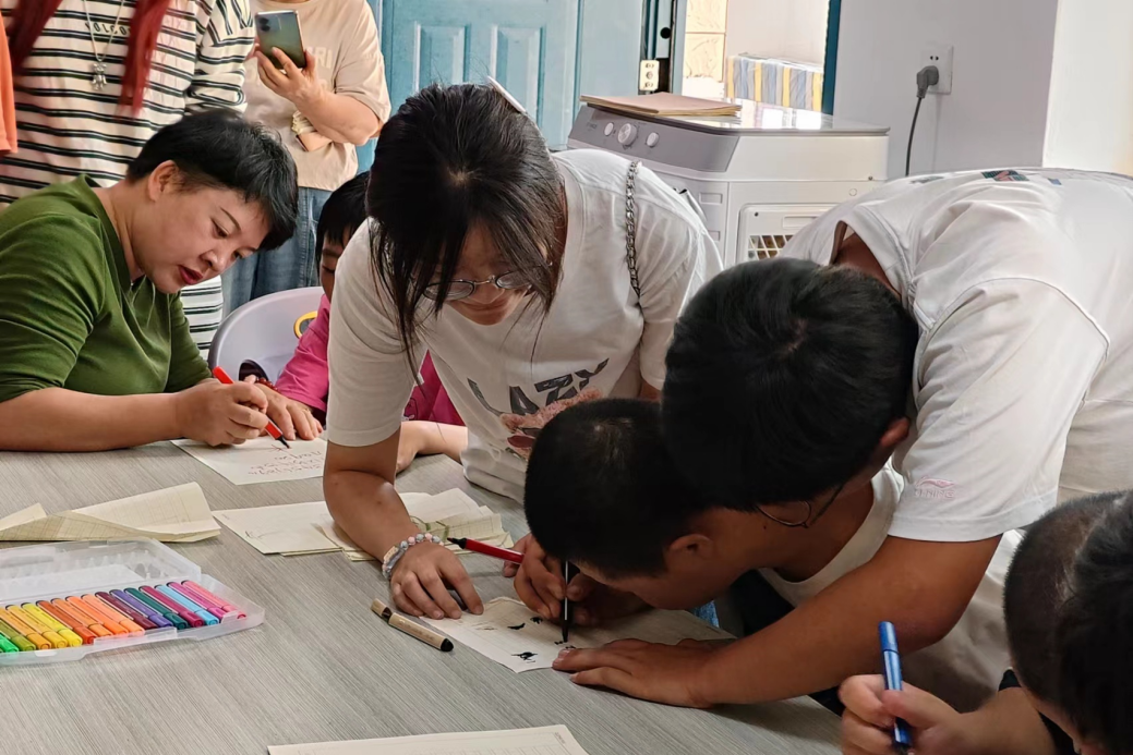 第二个环节,成员们为孩子们带来一堂基础的数学课,通过手把手教学让孩子们写出数字。每个孩子旁边都有两个志愿者进行帮助,手把手教他们书写,对于写的快记得牢的孩子,团队成员也会鼓掌表扬,以此激发其他孩子的动力。通过反复的练习,启发孩子们的思维,帮助他们康复。