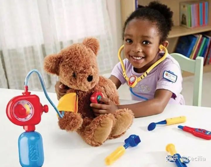 孩子可以通过玩偶、动物等玩具角色以及食物、器具、汽车、飞机和建筑物等玩具对象,来开展假装游戏(pretend game)。