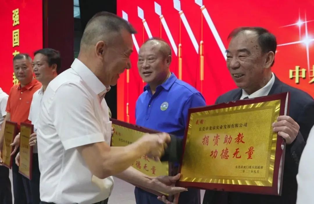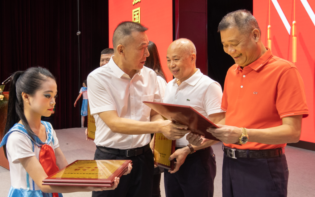蒋亚军、吴庆球为虎门镇工商联(商会)会员及会员代表颁发荣誉牌匾,虎门工商联捐赠550万元给虎门教育基金。