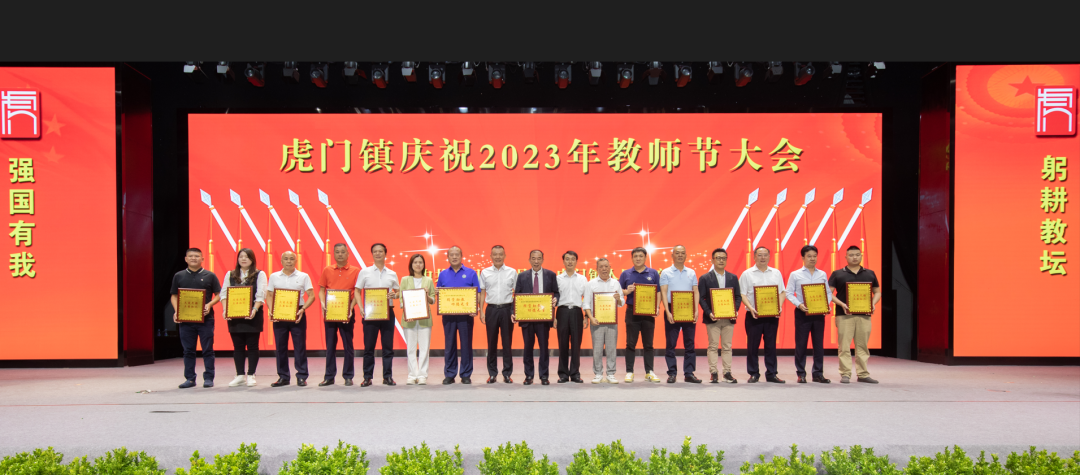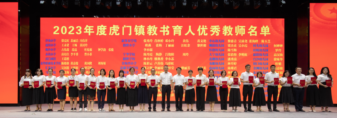 虎门镇党委书记蒋亚军,虎门镇党委副书记、镇长吴庆球为2023虎门镇教书育人优秀教师代表颁发荣誉证书