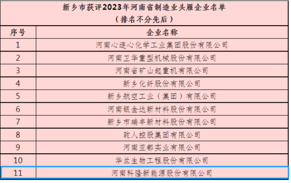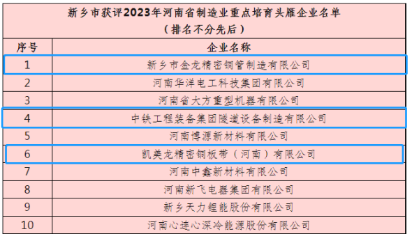 近日,河南省工信厅公布2023年河南省制造业头雁企业和2023年河南省制造业重点培育头雁企业名单,新乡市11家企业获评2023年河南省制造业头雁企业,其中卫滨区1家为:河南科隆新能源股份有限公司;新乡市10家企业入选2023年河南省制造业重点培育头雁企业,其中卫滨区3家,分别为:新乡市金龙精密铜管制造有限公司、凯美龙精密铜板带(河南)有限公司、中铁工程装备集团隧道设备制造有限公司。