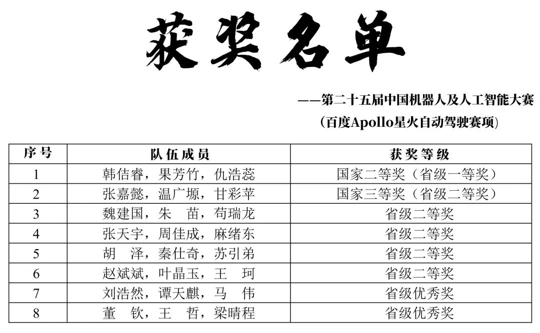 近日,第二十五届中国机器人及人工智能大赛在四川绵阳举行,比赛共吸引哈尔滨工业大学、东南大学、北京理工大学等全国120余所高等院校的近300支队伍参加。在学校创新创业学院的指导和支持下,机电工程学院武振锋、丁强军等教师指导的学生团队参加了百度Apollo星火自动驾驶赛项的角逐,并取得优异成绩,获得国家二等奖1项,三等奖1项。