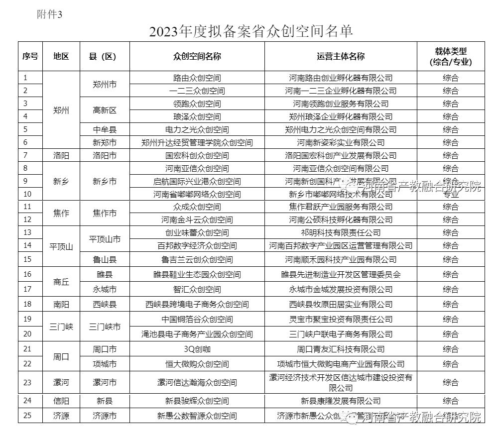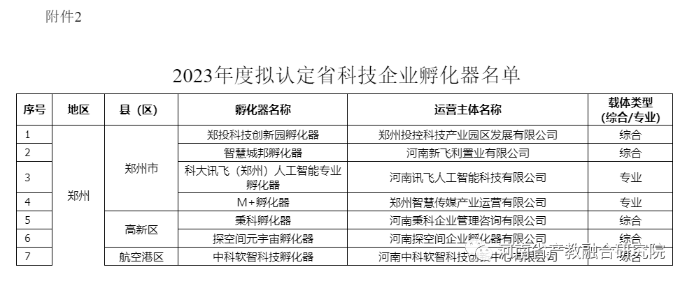 根据《河南省大学科技园管理办法》(豫科〔2019〕137号)、《河南省科技企业孵化器管理办法》(豫科〔2019〕35号)、《河南省众创空间管理办法》(豫科〔2020〕101号)和关于组织开展2023年度河南省科技企业孵化器、众创空间、大学科技园认定备案工作的通知》(豫科企〔2023〕4号)要求,通过专家评审,经厅长办公会研究通过,于2023年8月30日—9月5日,在河南省科技厅网站公示了拟认定的4家河南省大学科技园、30家河南省科技企业孵化器,和拟备案的25家河南省众创空间。