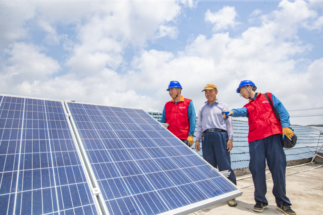 ▲国家电网山东电力共产党员服务队队员在陈疃镇卞家庄村帮助客户检查光伏设备
