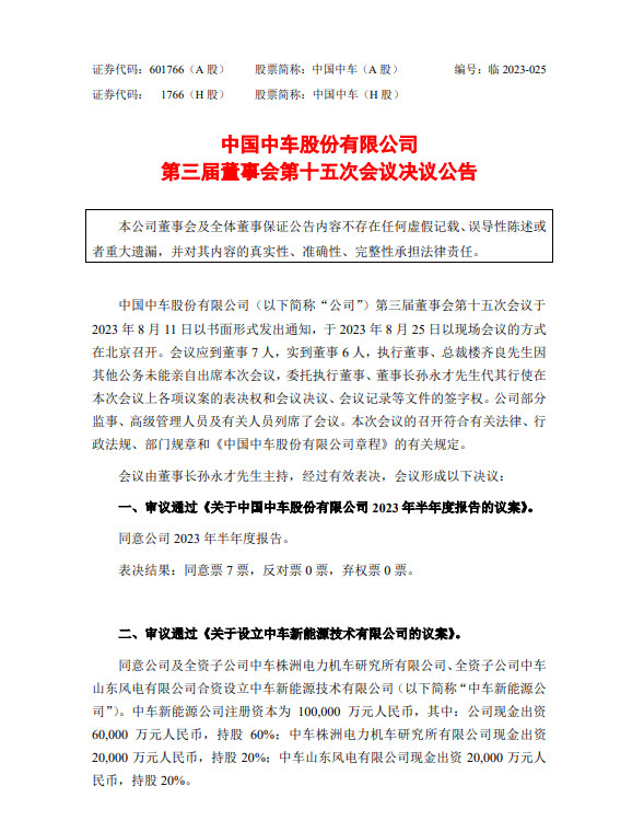8月25日,中国中车股份有限公司(以下简称“中国中车”)发布第三届董事会第十五次会议决议公告。