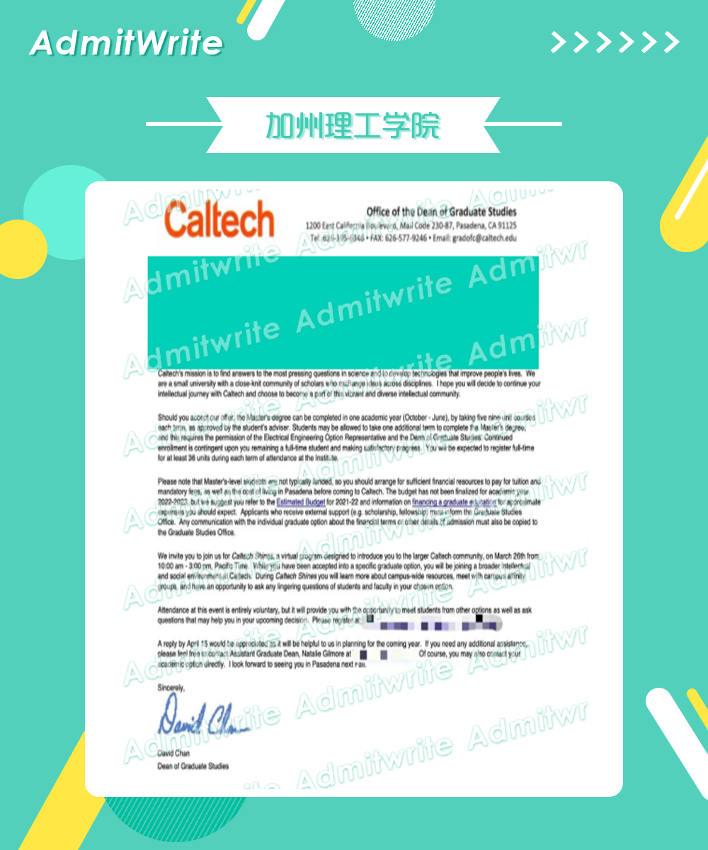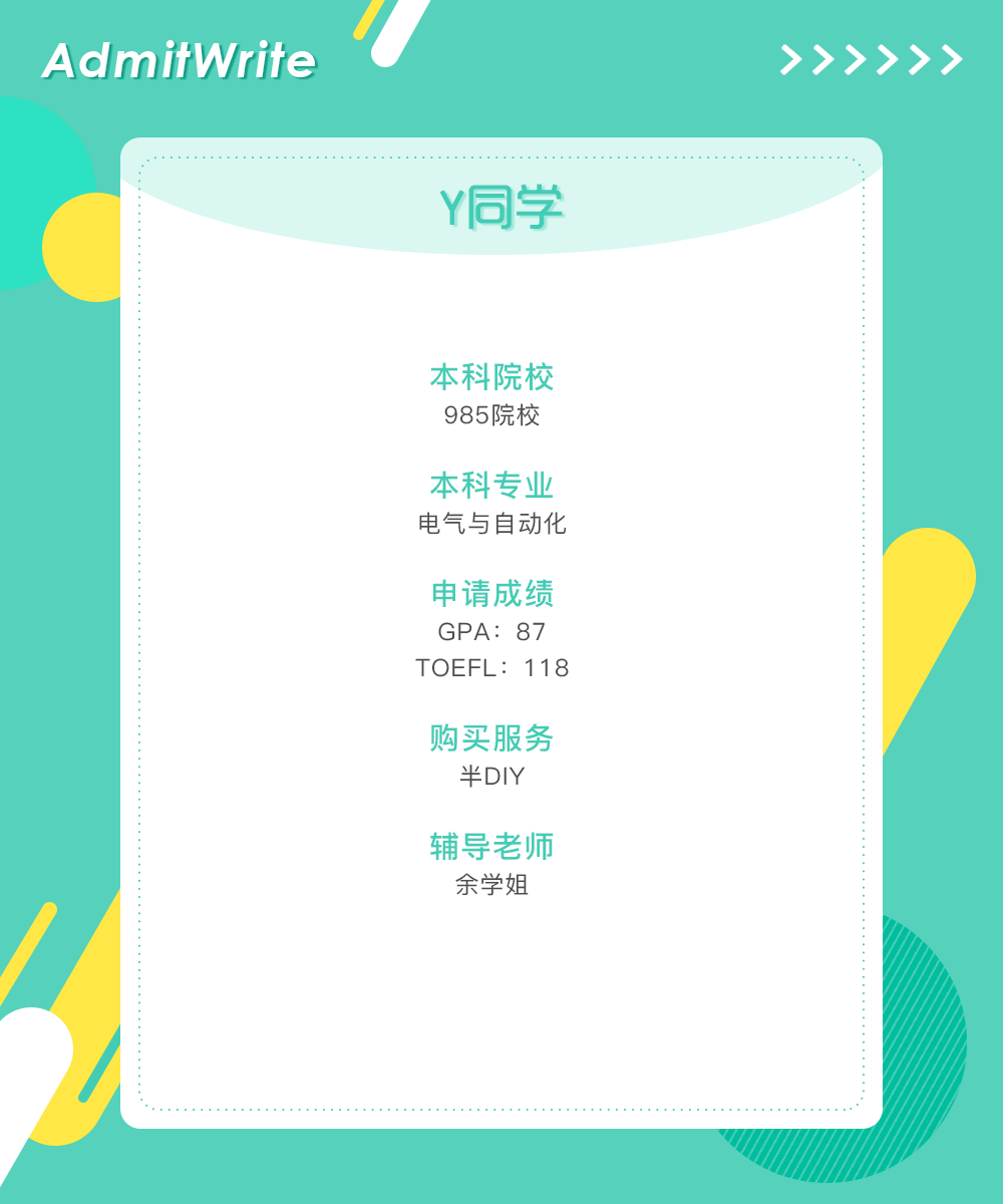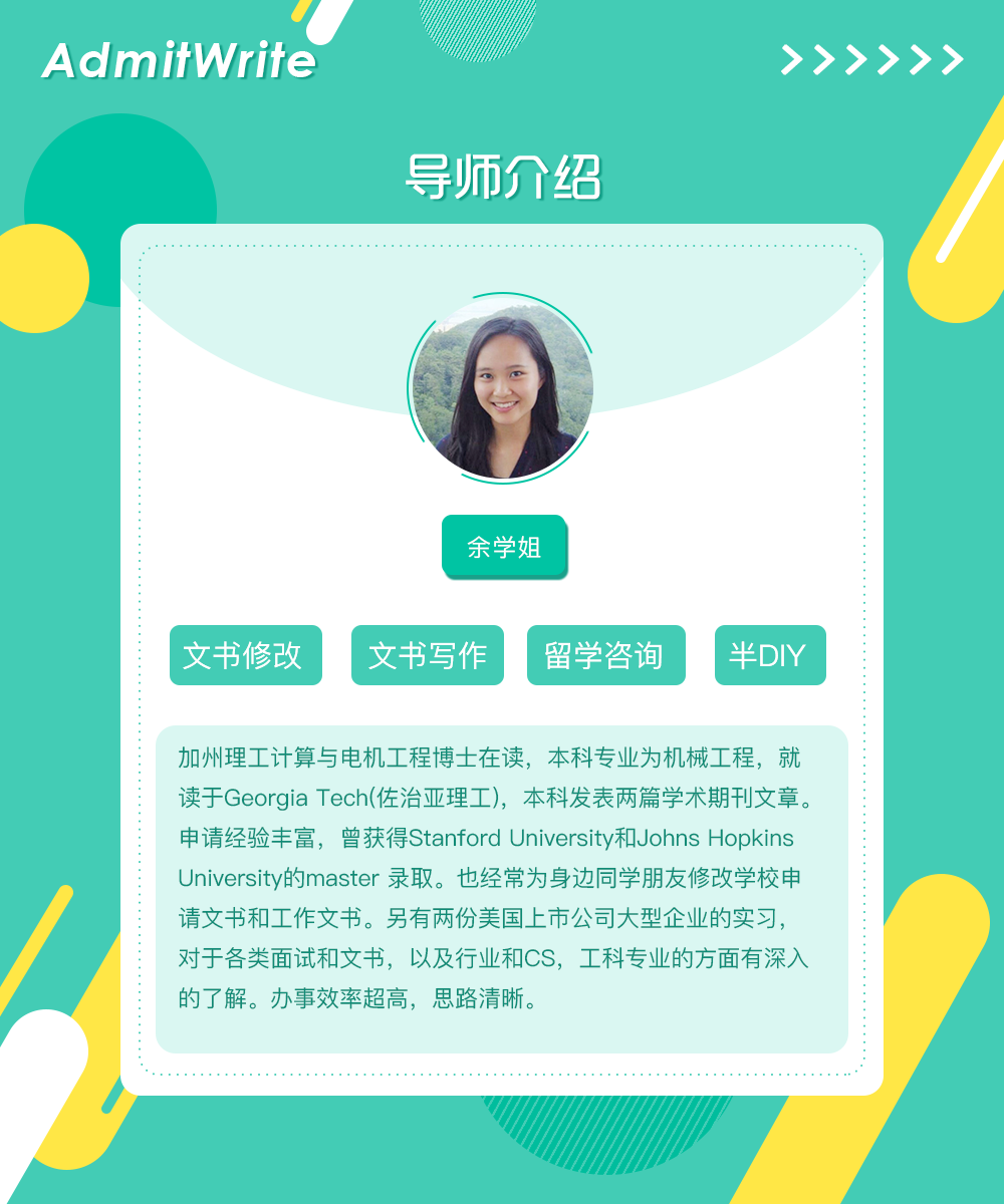 我的本科院校背景是985院校。自从有留学想法开始,我就想申请美国排名靠前的学校,为之也做了许多准备,家里人也非常支持我去美国的加州理工学院留学的想法,所以很早就在给我问靠谱的机构了,在对比了几家比较大的机构之后,最终选择了admitwrite留学机构。